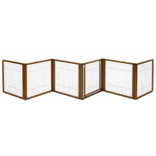 This gate can also be converted into a pet pen. This wonderful gate comes in a 6-panel design with a rich brown hardwood finish. To create a stable room divider this gate must be set up in a zigzag pattern which is secured in place with cap-locks. To create a stable Freestanding gate, the two end panels of this gate must be folded in on a 90 degree angle which is held in place with the cap-locks.